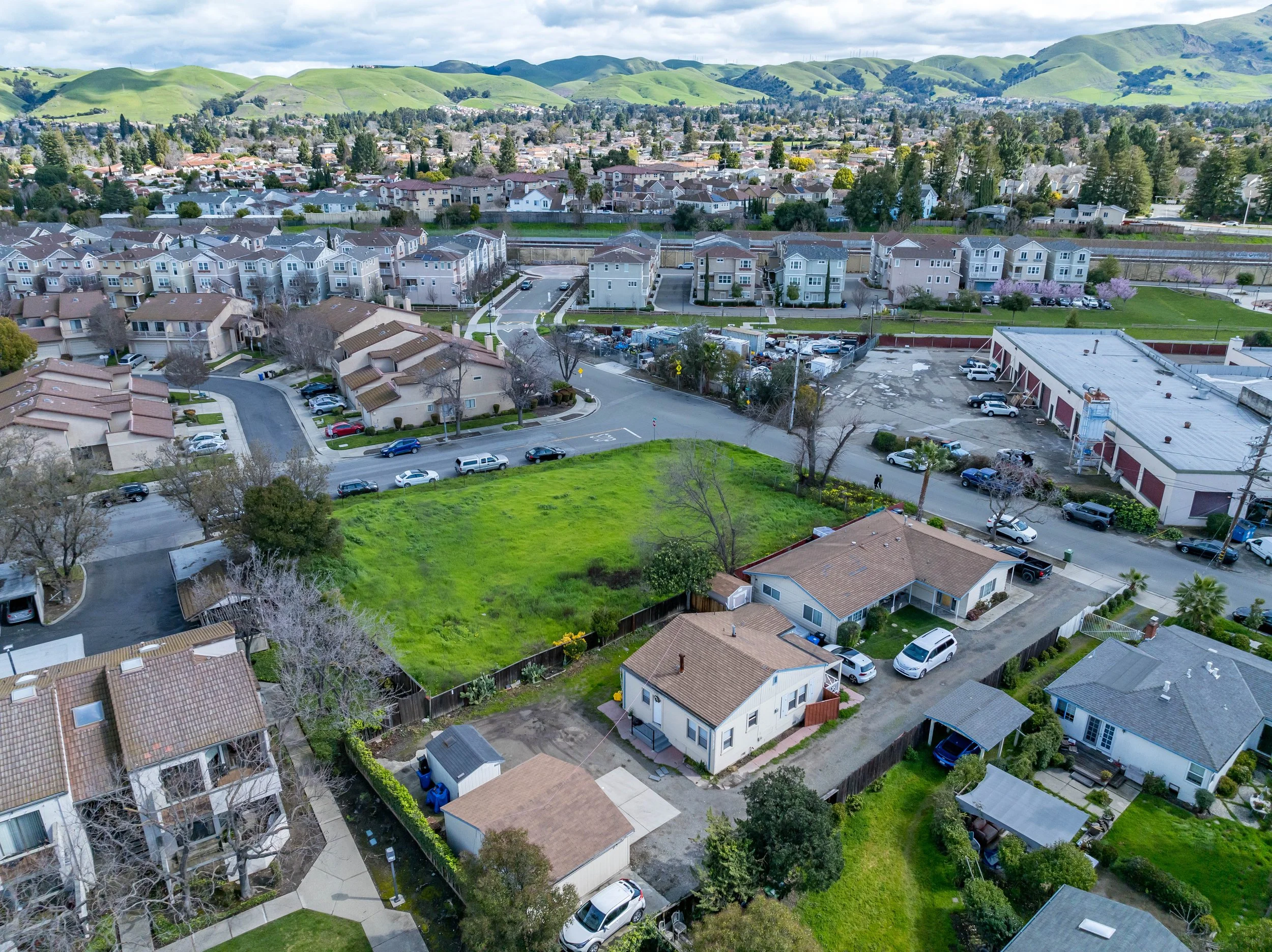 Aerial view of a suburban neighborhood with houses, streets, and green hills in the background.