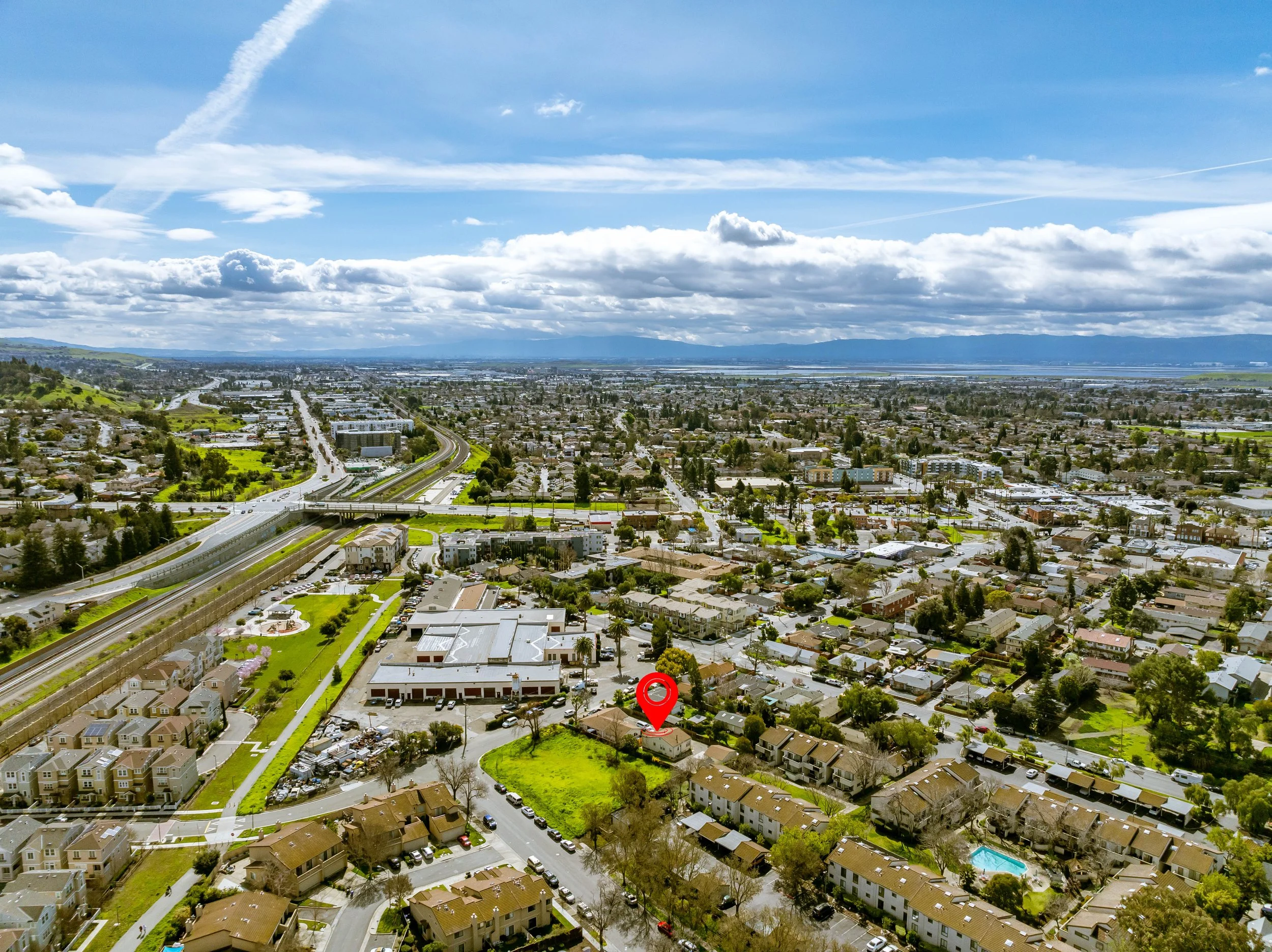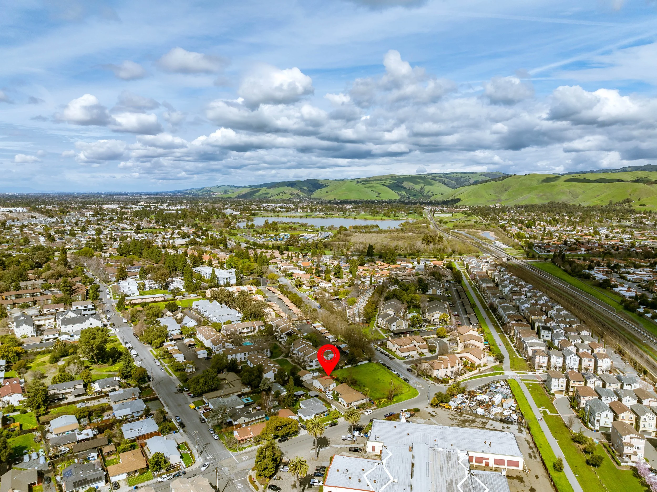 Aerial view of a suburban neighborhood with green hills in the background. Features houses, roads, a commercial building, and a red location pin marking a specific spot.