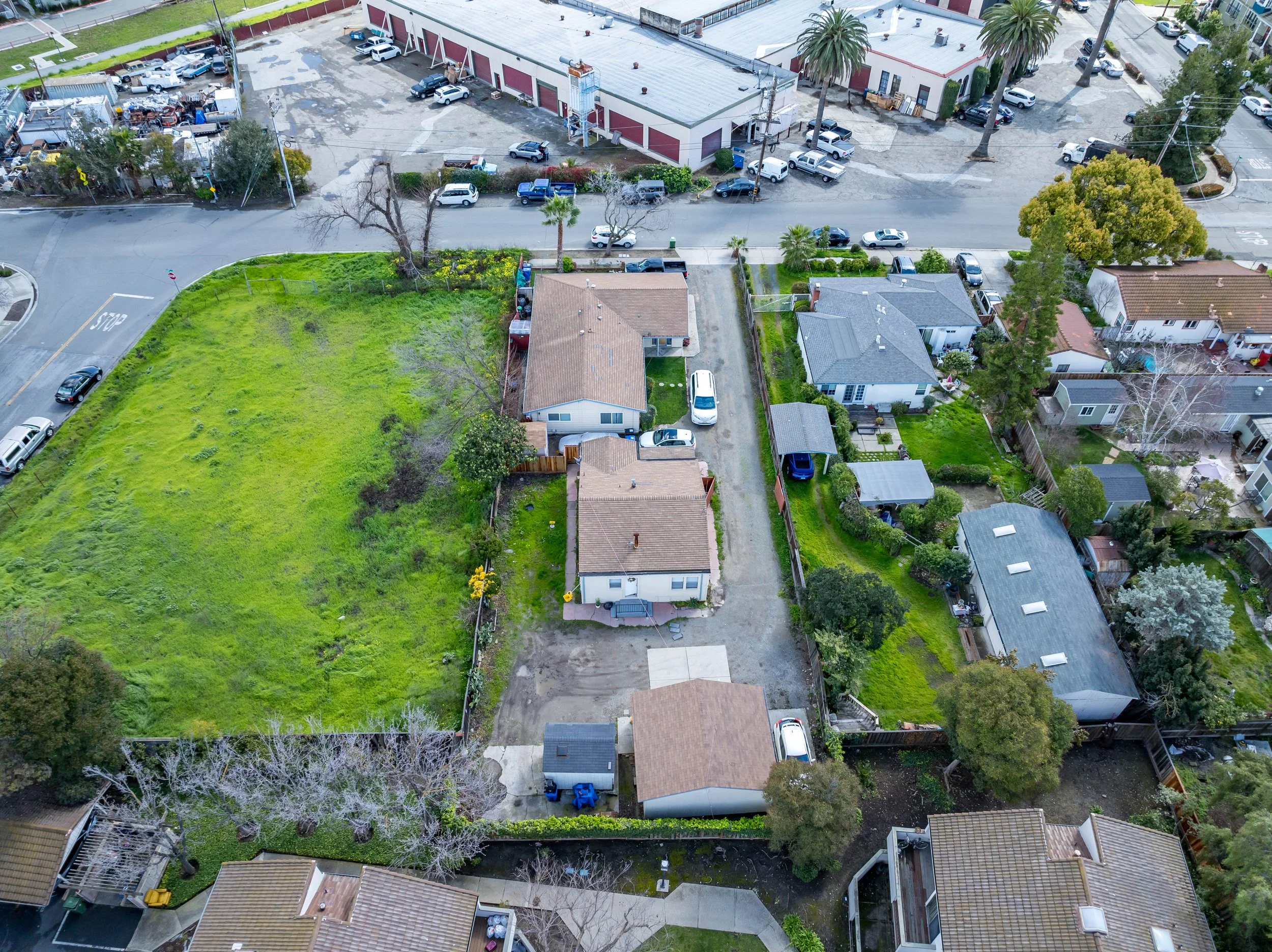 Aerial view of a residential neighborhood with houses, green lawns, and a vacant grassy lot. A road and industrial buildings with parked cars are visible in the background.